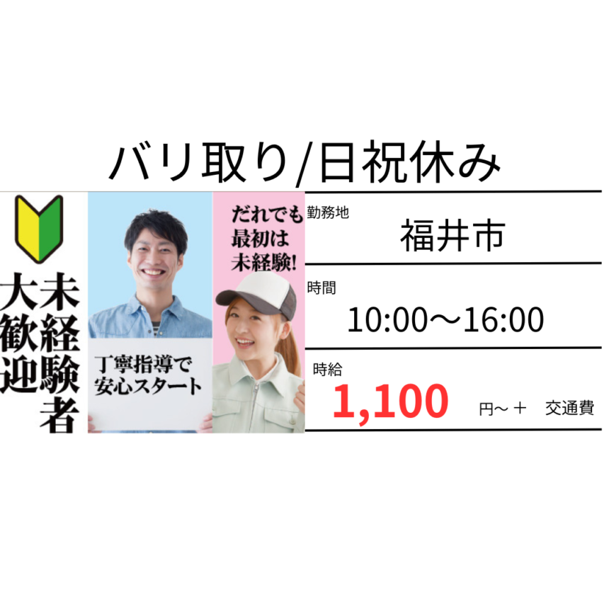 1. 【福井市南部】金属加工作業員/時給1300~1500円/高時給/日勤勤務★応募は下部のオンライン仮登録ボタンから!★
